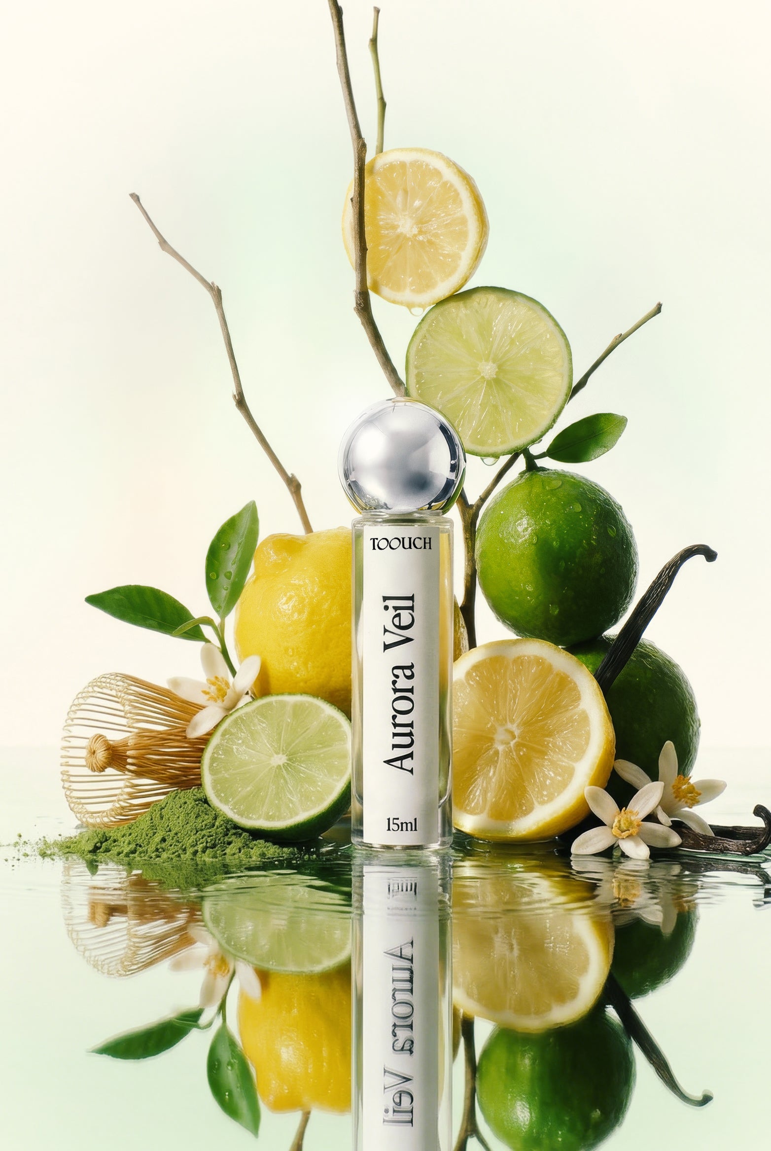 Aurora Veil opens with a bright blend of citrus and fresh matcha, bringing the soft radiance of a new day.In the heart, orange blossom and a creamy powdery nuance add a tender sweetness that makes the scent feel even more comforting. As it settles, vanilla, musk and warm woods embrace the skin, soothing away the day’s heaviness and leaving behind a quiet sense of peace.